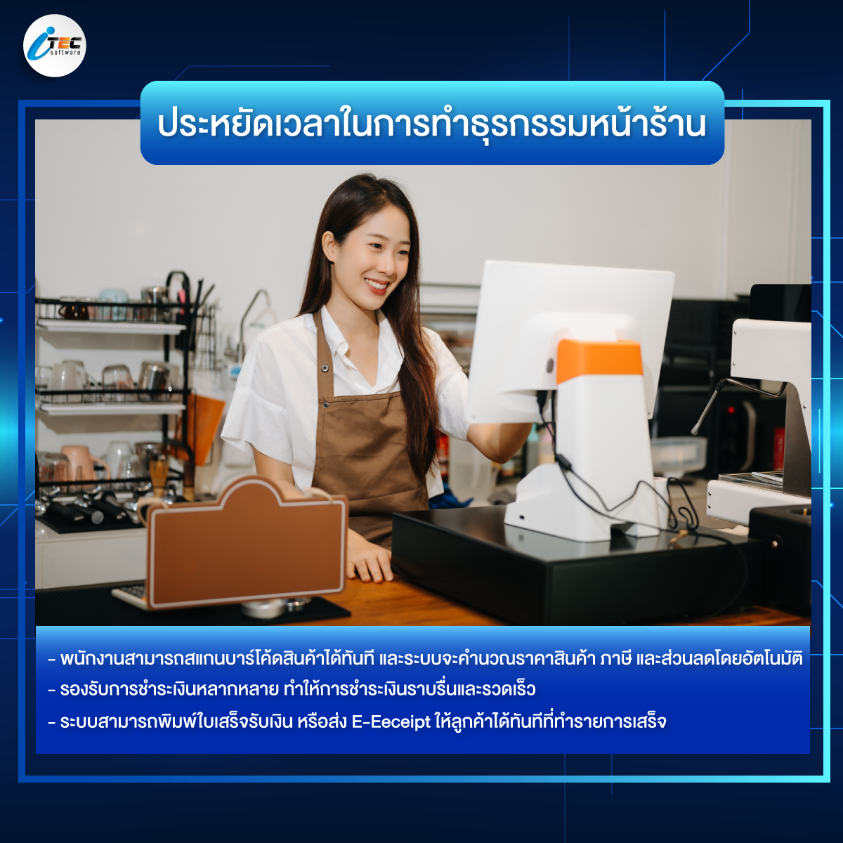 1. ประหยัดเวลาในการทำธุรกรรมหน้าร้าน : พนักงานสามารถสแกนบาร์โค้ดสินค้าได้ทันที ระบบจะคำนวณราคาสินค้า ภาษี และส่วนลดโดยอัตโนมัติ ทำให้ไม่ต้องเสียเวลาในการคิดคำนวณด้วยมือหรือเครื่องคิดเลข ซึ่งช่วยลดเวลาการรอคิวของลูกค้าได้อย่างมาก อีกทั้งยังรองรับการชำระเงินหลายรูปแบบ เช่น เงินสด, บัตรเครดิต/เดบิต, QR Code, E-wallet โดยเชื่อมต่อโดยตรงกับเครื่องอ่านบัตรหรือแอปพลิเคชันชำระเงิน ทำให้กระบวนการชำระเงินราบรื่นและรวดเร็ว
