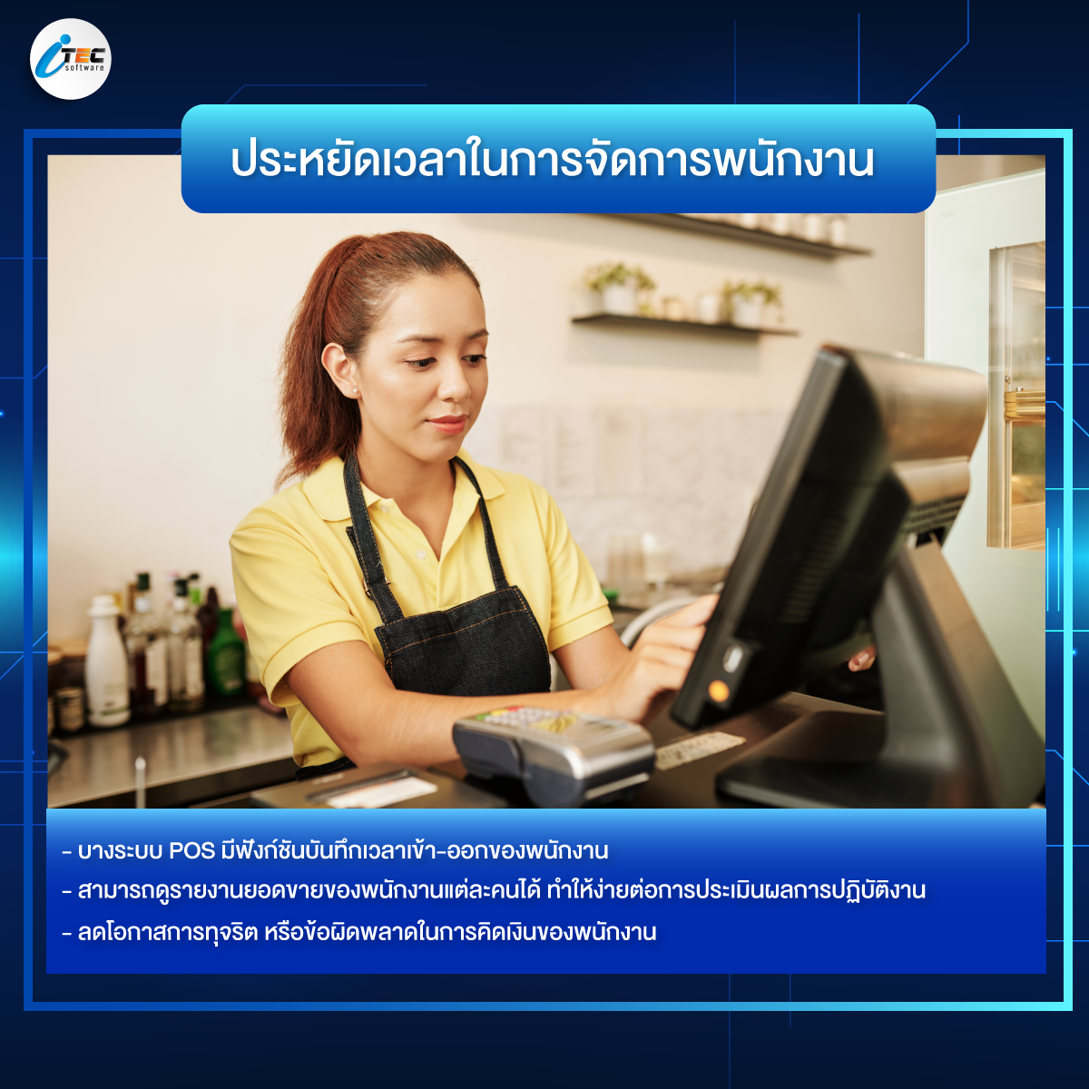3. ประหยัดเวลาในการจัดการพนักงาน : บางระบบ POS มีฟังก์ชันบันทึกเวลาเข้า-ออกของพนักงาน ทำให้ไม่ต้องใช้การลงเวลาด้วยมือ และสามารถดูรายงานยอดขายของพนักงานแต่ละคนได้ ช่วยประหยัดเวลาในการประเมินผลการปฏิบัติงาน อีกทั้งยังลดโอกาสการทุจริตหรือข้อผิดพลาดในการคิดเงินของพนักงาน