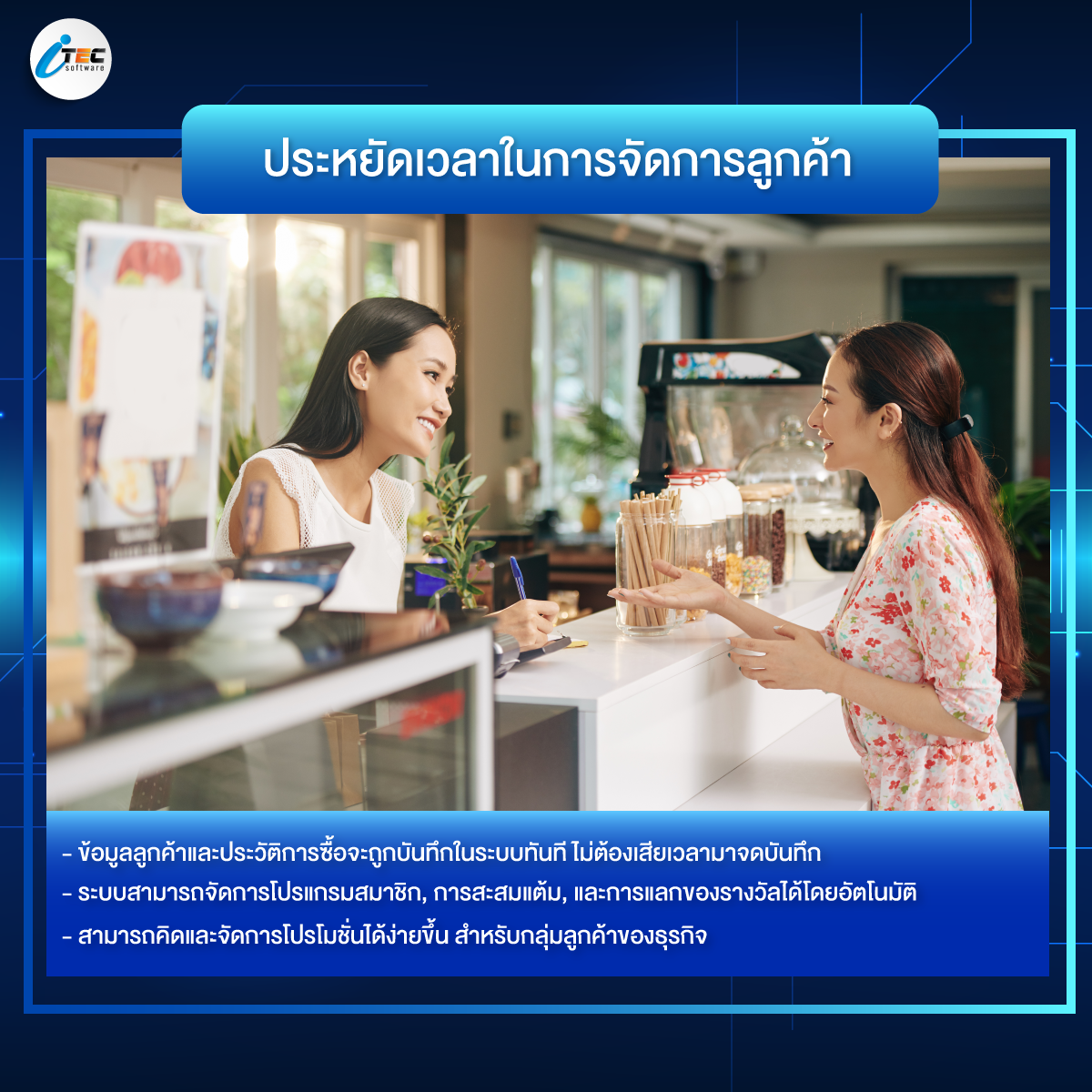 4. ประหยัดเวลาในการจัดการลูกค้า : เมื่อลูกค้าซื้อสินค้า ข้อมูลลูกค้าและประวัติการซื้อจะถูกบันทึกในระบบทันที ไม่ต้องเสียเวลามาจดบันทึก และระบบยังสามารถจัดการโปรแกรมสมาชิก, การสะสมแต้ม, และการแลกของรางวัลได้โดยอัตโนมัติ ลดภาระงานของพนักงาน