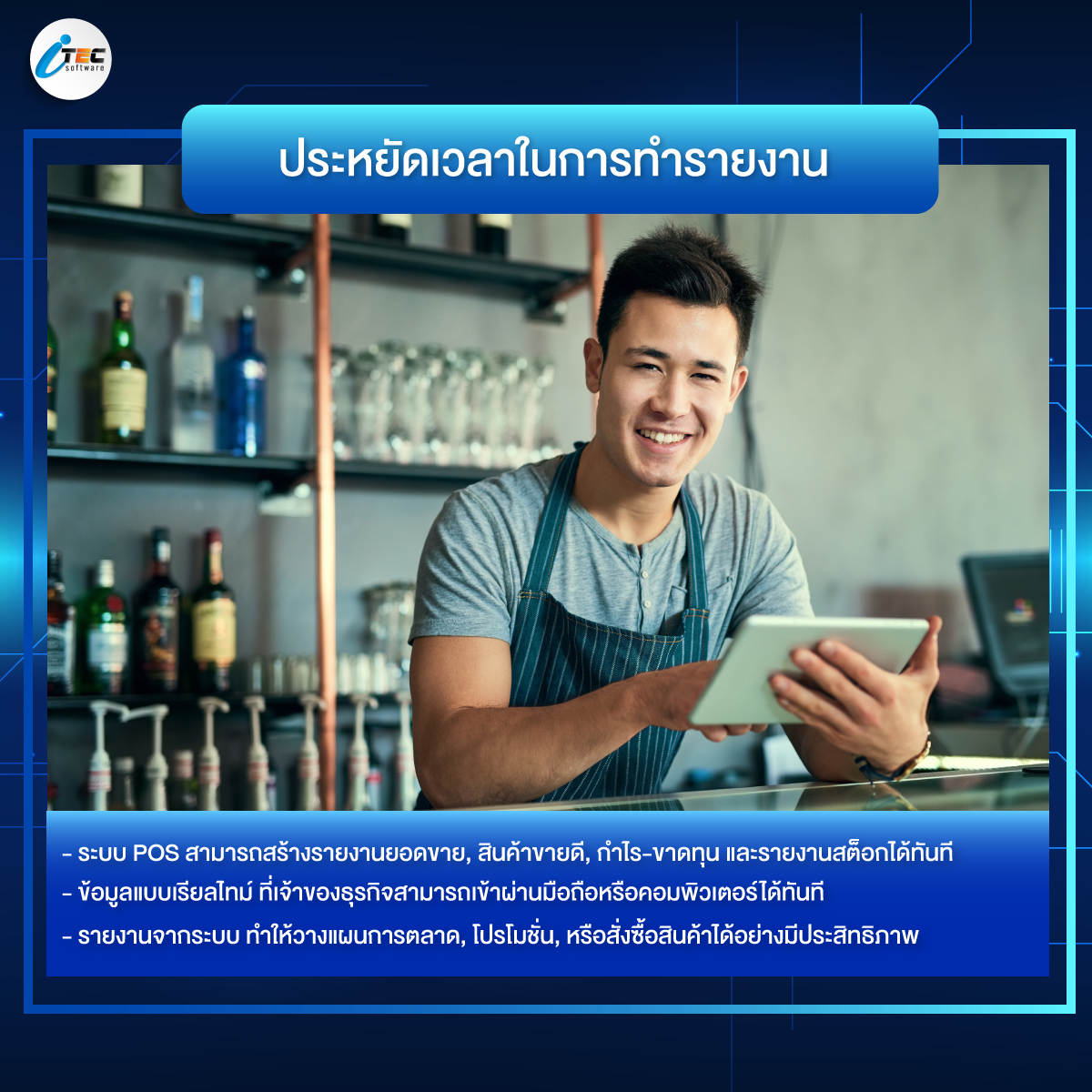 5. ประหยัดเวลาในการทำรายงานและวิเคราะห์ข้อมูล : POS สามารถสร้างรายงานยอดขาย, สินค้าขายดี, กำไร-ขาดทุน, รายงานสต็อก, รายงานการปฏิบัติงานของพนักงานได้โดยอัตโนมัติ ไม่ต้องเสียเวลาในการรวบรวมข้อมูล และเจ้าของธุรกิจสามารถเข้าถึงข้อมูลและรายงานเหล่านี้ได้แบบเรียลไทม์ ทำให้สามารถตัดสินใจทางธุรกิจได้อย่างรวดเร็วและแม่นยำ โดยไม่ต้องรอรวบรวมข้อมูล รายงานจากระบบทำให้วิเคราะห์พฤติกรรมการซื้อของลูกค้า, วางแผนการตลาด, โปรโมชั่น, หรือการสั่งซื้อสินค้าได้อย่างมีประสิทธิภาพ